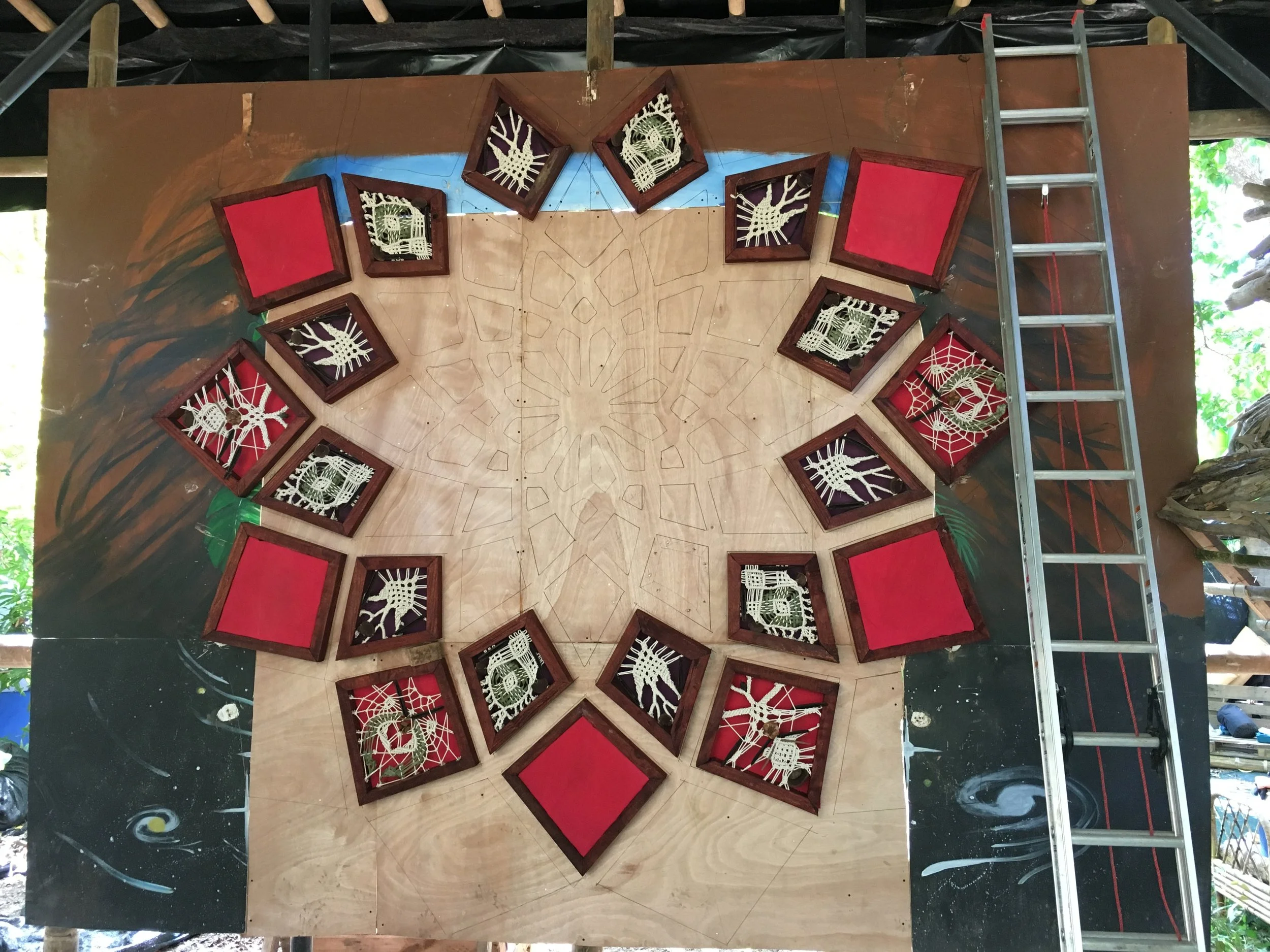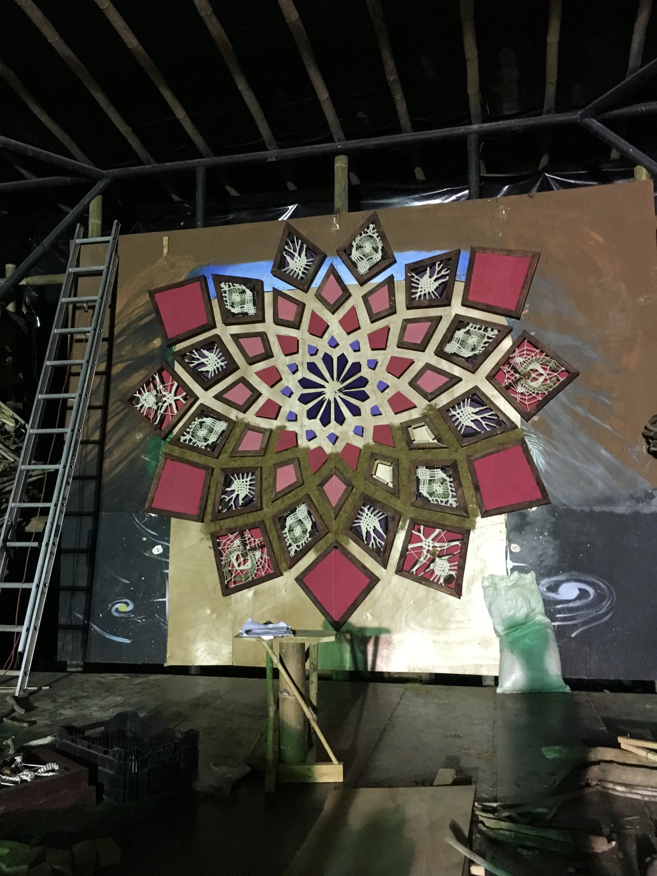 As build lead for the village stage at Envision 2020 I worked directly with Selva Bairavi, the artist who designed and managed the stage build. The various elements of her design incorporated two facets. The first was the fabricated wood, bamboo, and driftwood elements which I was tasked to fabricate and install. The second was comprised of the beautiful weaved elements that were created by a team of macramé weavers led by Selva. The prominent feature of the stage was the mandala backdrop, which included the weavings of the artist and her team. I created a layout drawing for the mandala and used that to project the pattern onto the backwall to create a template for the installation of the panels that comprised it. This project presented daily creative problem solving challenges. My skills were regularly put to the test and there was much creative growth as a result of it.