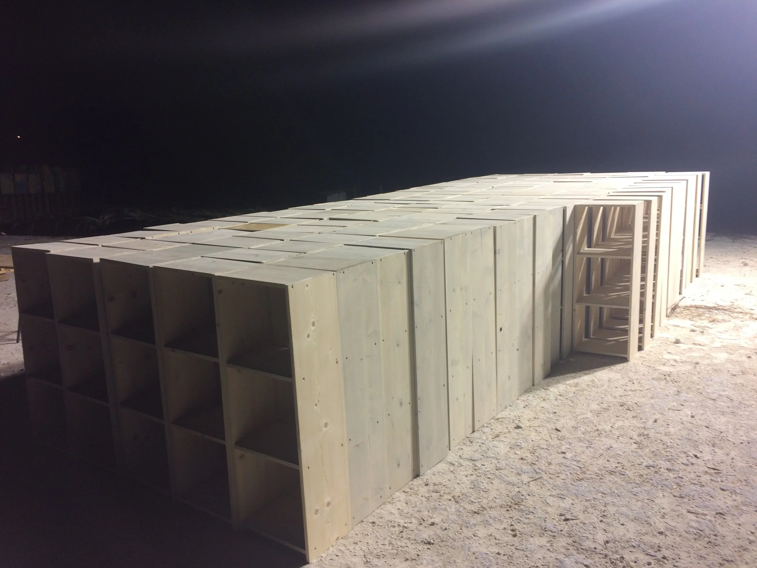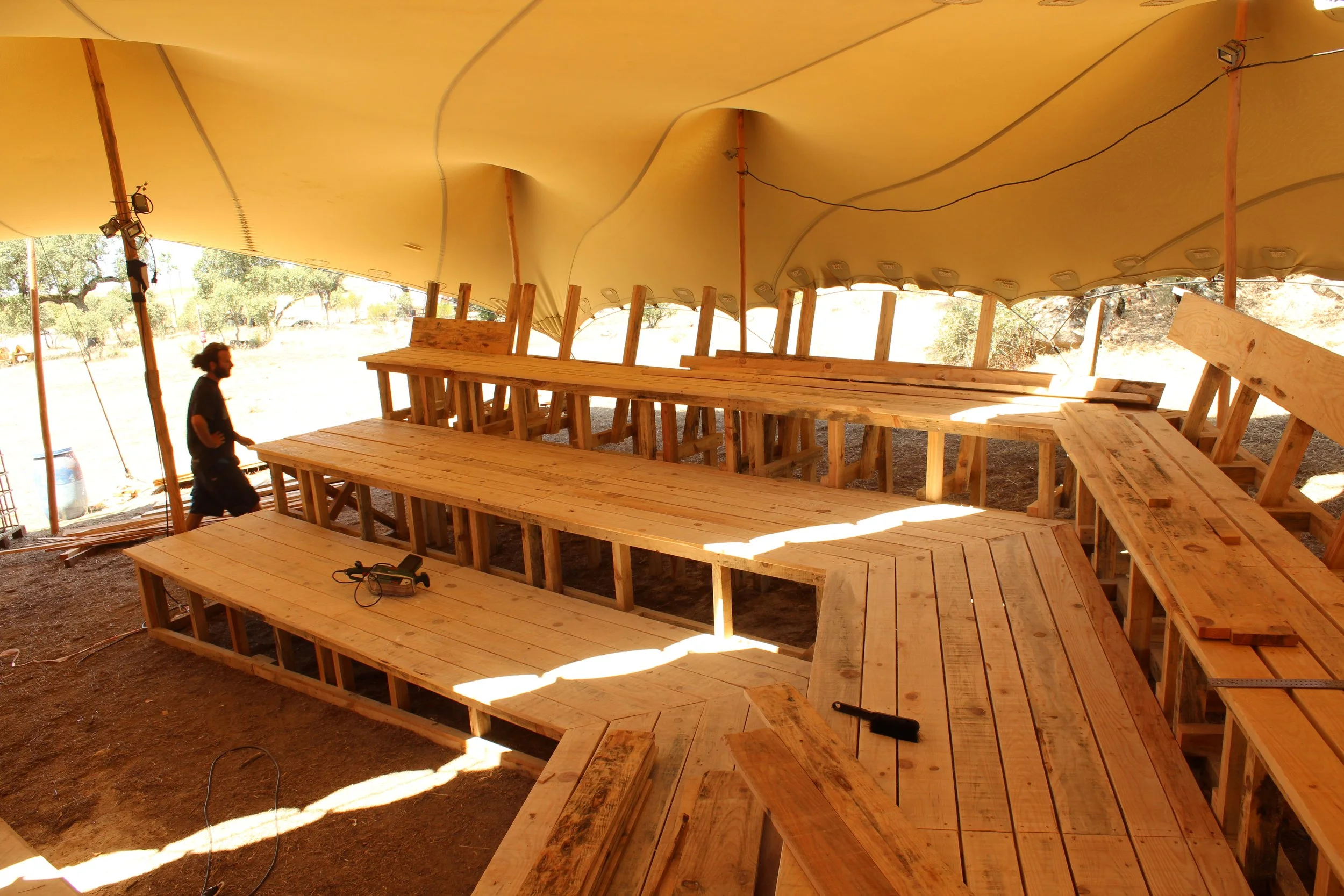 In 2018 I flew out to Idanha-Nova, Portugal to spend two and a half months as part of build team for the Alchemy Circle Village at Boom Festival. I was one of two hired carpenters working alongside a team of volunteers. During this time we designed and built a variety of creative infrastructure for the village including furniture, garden sculptures, decking, planters, bike racks, and anything else that needed to be fabricated. We also built the MOVA(museum of visionary art) Gallery and equipped it with gallery walls, bleacher seating, and a deck for live painters. Android Jones had brought his “Micro dose VR” installation to the MOVA Gallery, and our team was tasked with fabricating the wooden dodecahedron forms that people would step inside to have the virtual reality experience.