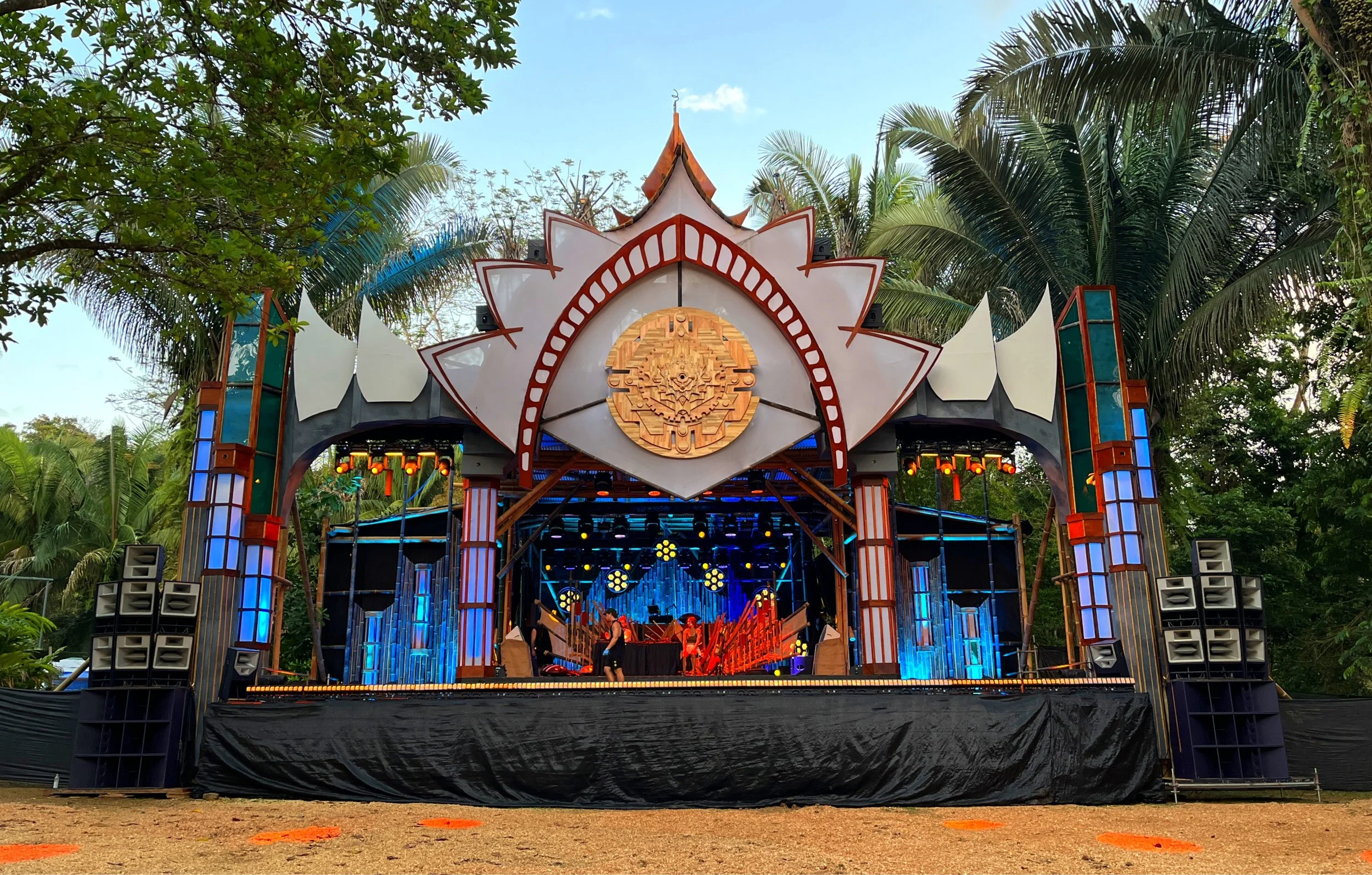 During the build, we assembled a crew of talented craft artisans and constructed this beautiful psychedelic deity emerging as a stamen from a flowering form. The bamboo and lumber side towers were architectural influences from La Sagrada Familia, Gaudi’s cathedral in Barcelona. Local tribes people from the Boruca Tribe of Costa Rica came in to hand carve the deity head, adding a meaningful indigenous element to the whole project.